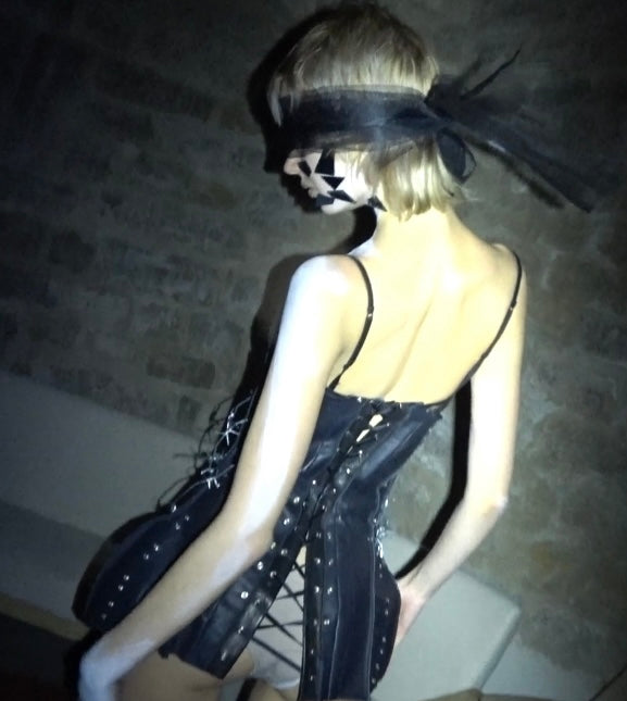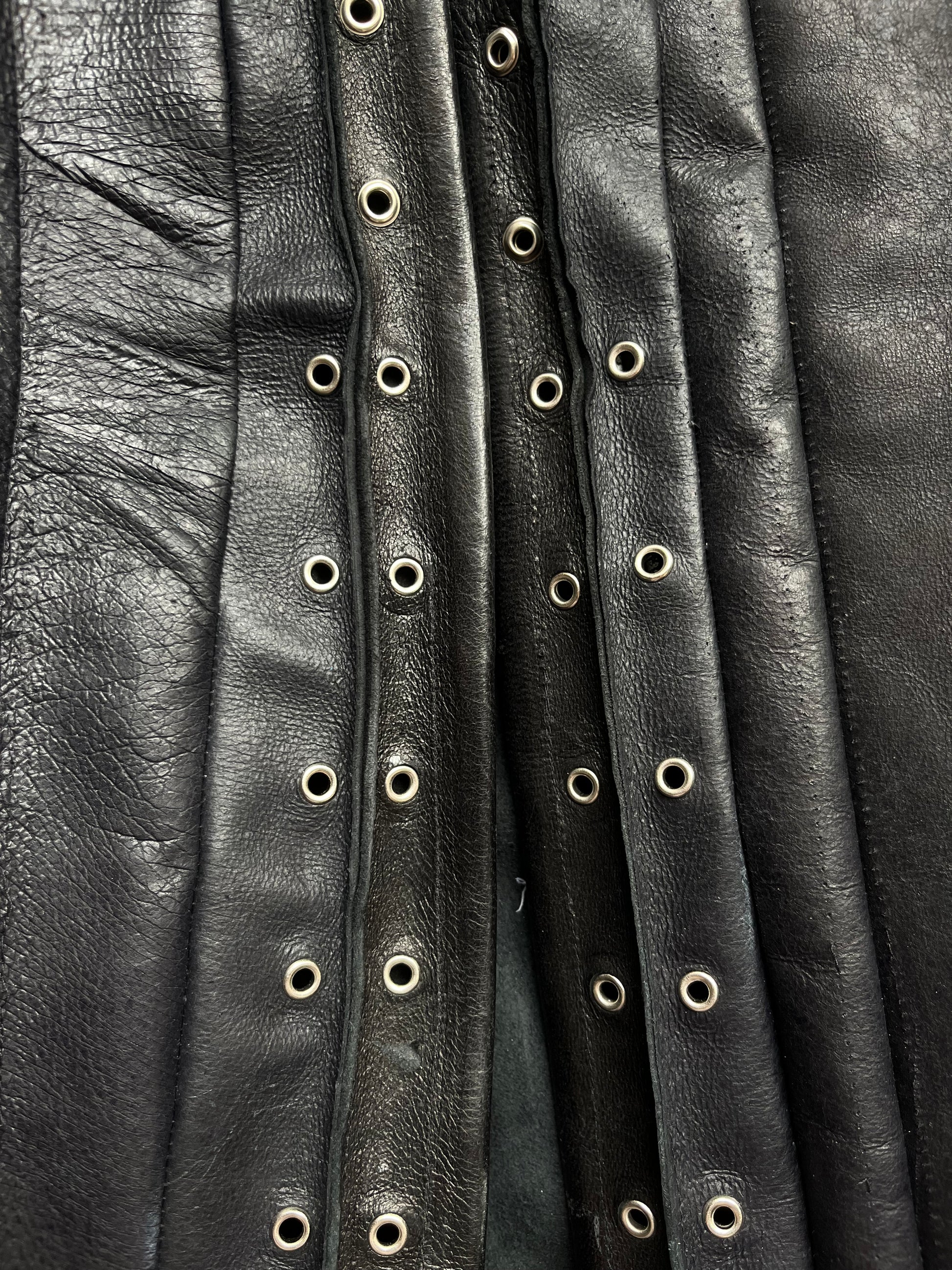 Made from 2 different steady leathers, heavy top stitching, boning, eyelets and barbed wire (can be made without on your request)